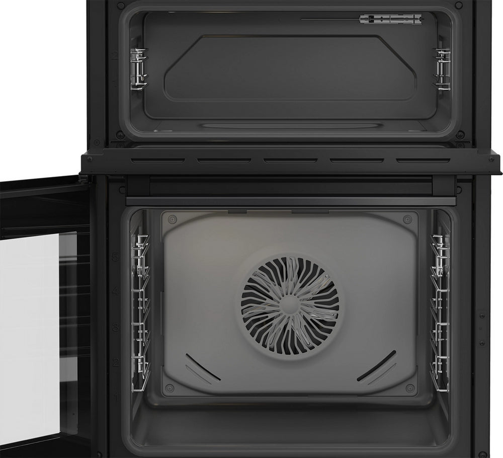 Equipped with a top electric conventional oven and a bottom electric fan oven, this double oven cooker offers a remarkable capacity of 38 litres in the first cavity and 75 litres in the second cavity. The drop-down door of the first oven and the side-opening door of the second ensure easy access, making cooking and baking convenient. Both ovens feature an easy clean enamel lining, taking the hassle out of maintenance and allowing you to focus on honing your culinary skills.