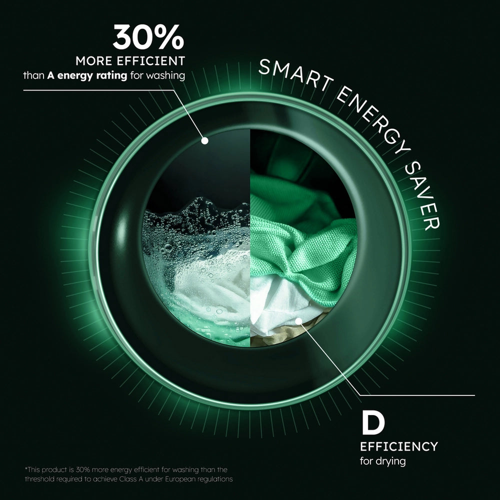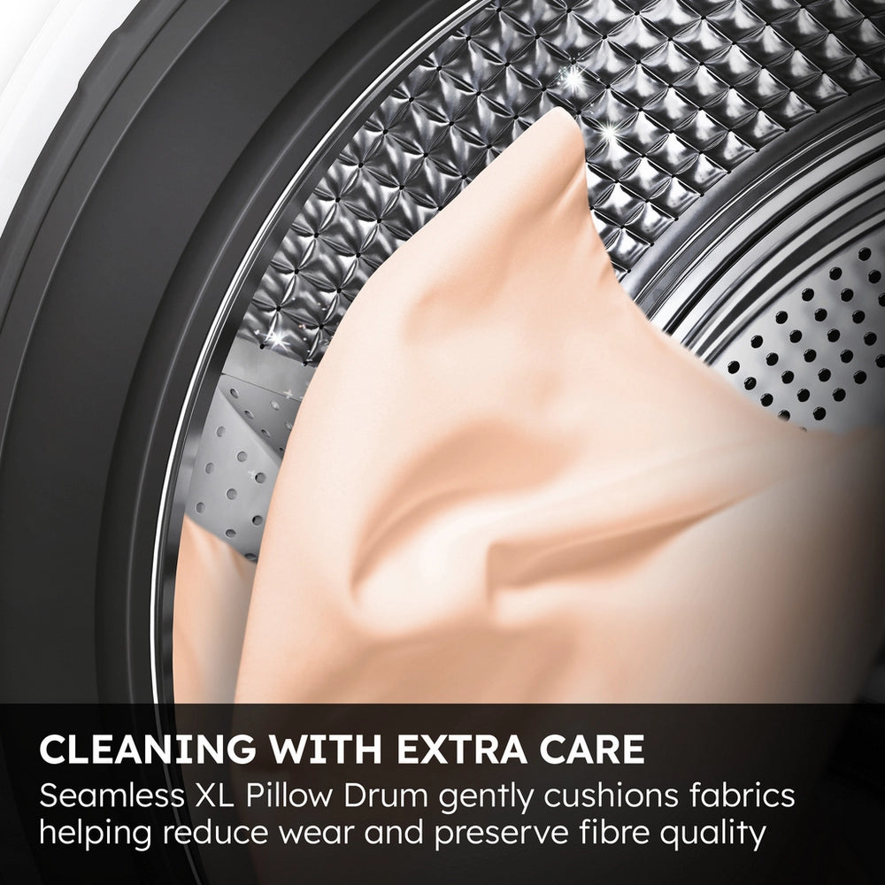 Additional features such as the Pillow Drum design and laser-welded structure prevent fabric snagging, enabling a gentle wash that takes care of your garments. With an energy efficiency class rating of A for washing, you can enjoy peace of mind knowing you’re making a sustainable choice.