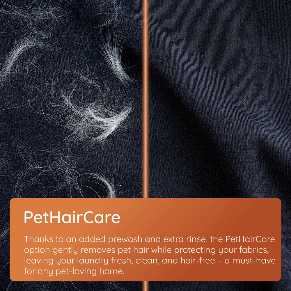 For pet owners, the dedicated PetHairCare cycle includes a prewash and extra rinse, effectively removing stubborn hairs from your clothing. Child-friendly features like a child lock and a wash progress indicator ensure peace of mind and convenience.