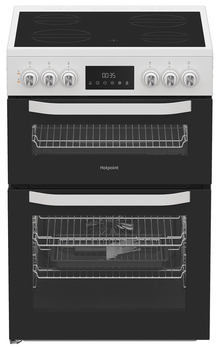 The Hotpoint HTE6VDCW 60cm Electric Cooker with Ceramic Hob in pristine white is a versatile cooking hub designed for modern homes. It combines a four‑zone ceramic hob with a two‑cavity oven, delivering responsive cooking, flexible baking, and straightforward cleaning in one reliable package.